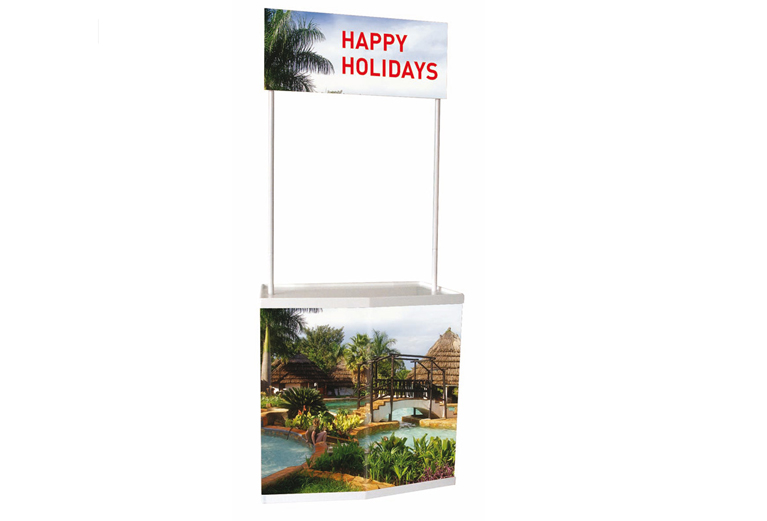 Deze kunststof balie is licht in gewicht, eenvoudig op te zetten en daarom de ideale werkruimte voor snelle presentaties. Totale hoogte: 2200 mm. Wordt in delen aangeleverd zonder tas (tas optioneel verkrijgbaar).