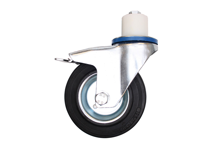 Zwenkwiel met plaatstalen velg en zwart rubber wiel 125 x 37 mm, totale hoogte 155,5 mm. In combinatie met een expander te gebruiken.