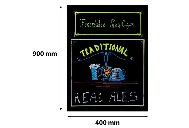 Bord voor het tonen van boodschappen in restaurants, cafés, winkelcentra en kantoren door het op te hangen of te plaatsen op een schildersezel. Krijtpennen UYAKLM1251-kleur of UYAKLM1250-wit apart te bestellen.