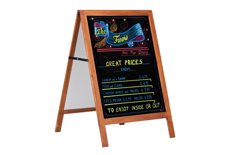 Stoepbord A-model massief licht hout 600 x 800 mm, eenvoudig te beschrijven met de daarvoor bestemde krijtpennen. Geschikt voor het plaatsen op het trottoir voor uw winkel, op parkeerplaatsen voor uw mobile winkel e.d.
