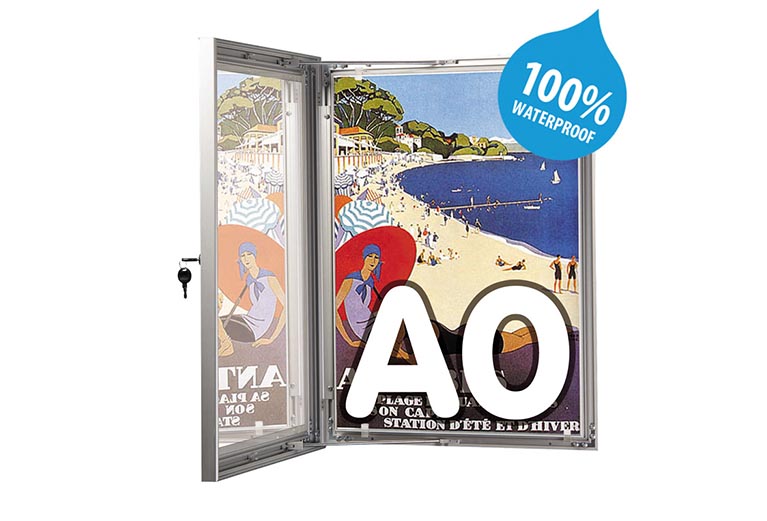 Showbord 100% waterdicht voorzien van slot met sleutel. Profielbreedte is 45 mm en kastdikte 30 mm. De deur valt om het profiel. Geschikt voor posters.