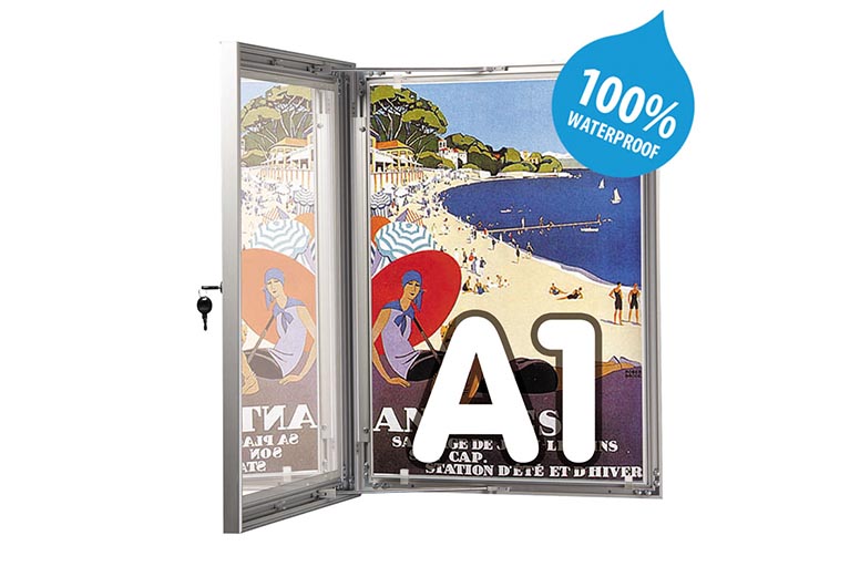 Showbord 100% waterdicht voorzien van slot met sleutel. Profielbreedte is 45 mm en kastdikte 30 mm. De deur valt om het profiel. Geschikt voor posters.