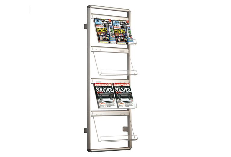 Brochuredisplay voor aan de muur. Het frame is rondom gesloten en wordt geleverd met alle toebehoren voor montage aan de muur.