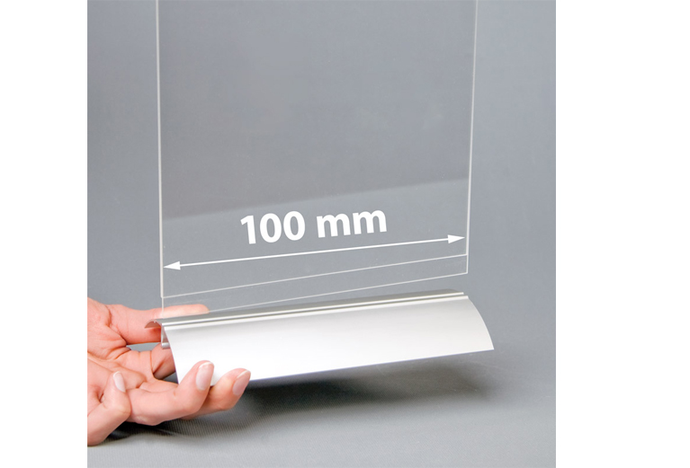 Klassiek afgewerkte flyerhouder met acrylaat houder en zilver geanodiseerd voetstuk. Ideaal voor gebruik in bijvoorbeeld restaurants als menukaart of op de toonbank van een winkel om een aanbieding aan te prijzen. Voetstuk ook los verkrijgbaar, zodat u hiervoor eigen plaatmateriaal kunt gebruiken.