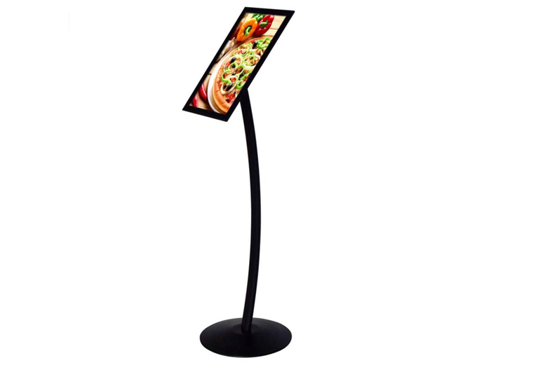 Het gebogen menubord is er met een zilveren en zwarte afwerking. De stijlvolle gebogen menubalk legt de aandacht van de klant in alle drukke verkeerszones. The Curved Menuboard is geschikt voor gebruik in hotels, galeries, musea, restaurants, lobby, bars, enz. Het is beschikbaar in A4 en A3 zowel staand als liggend.