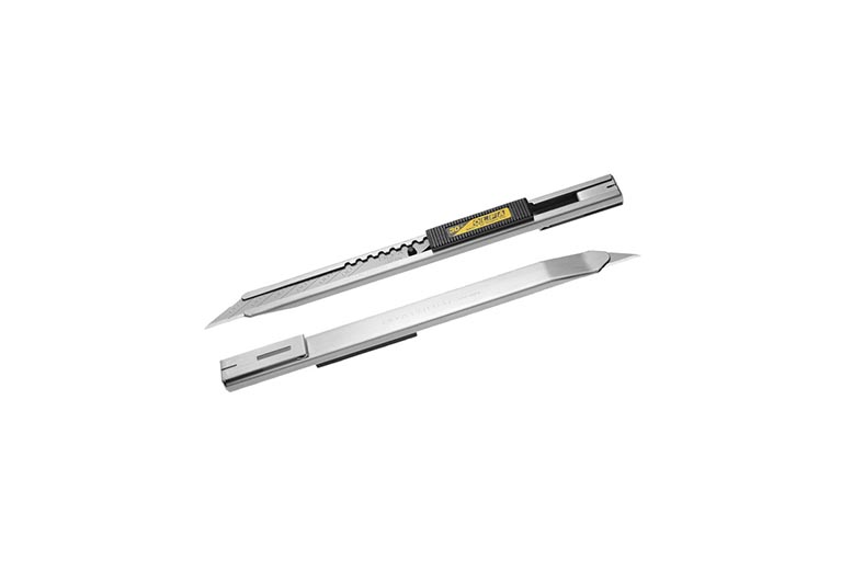 Stevige roestvrij stalen houder. Afbreekmes 9 mm onder een hoek van 30° voor grafische precisie klussen. Gewicht 18 gram.