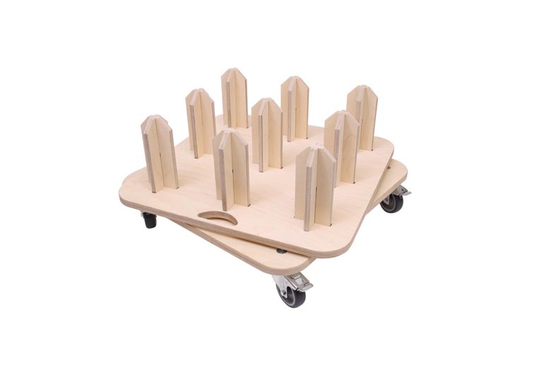 Folierollentrolley met multiplex draaitafel voor de veilige opslag van 9 filmrollen. Geschikt voor rollen met een diameter van 75 mm. De rolhouder is geschikt tot een gewicht van ca. 250 kg. Afmetingen: (B x L x H) 55 x 55 x 30 cm.