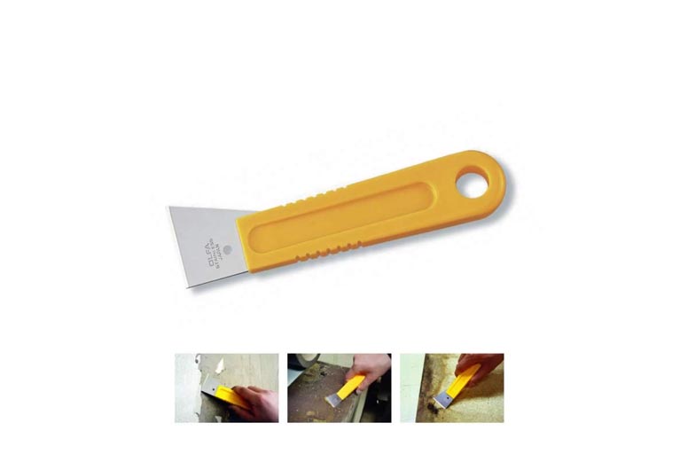Schrapers voor het verwijderen van folies en oude verflagen. Drie mes afmetingen: 25, 43 en 60 mm breed.