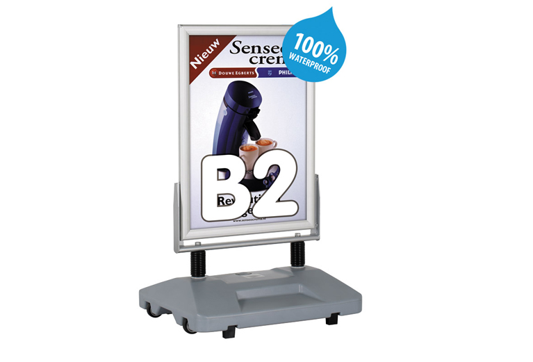 Robuust en waterbestendig stoepbord voorzien van klikprofielen en een vulbaar voetstuk met wielen. Gemakkelijk van binnen naar buiten te transporteren. In diverse maten verkrijgbaar. Voorzien van een PVC folie anti-reflex 0,5 mm.