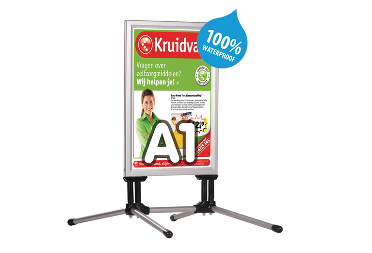 Waterbestendig stoepbord, voorzien van een klikprofiel en een H-voetstuk.