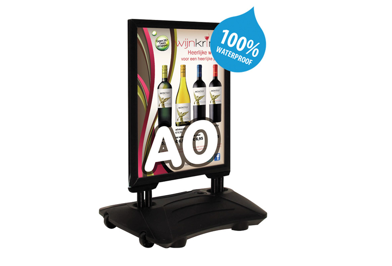 Waterbestendig stoepbord voorzien van zwart gepoedercoat klikprofiel en frame met een vulbaar voetstuk met wielen, eveneens in zwart uitgevoerd. Opvallend en stijlvol in het straatbeeld.
