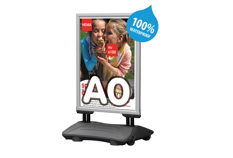 Waterbestendig stoepbord voorzien van zwart gepoedercoat klikprofiel en frame met een vulbaar voetstuk met wielen, eveneens in zwart uitgevoerd. Opvallend en stijlvol in het straatbeeld.